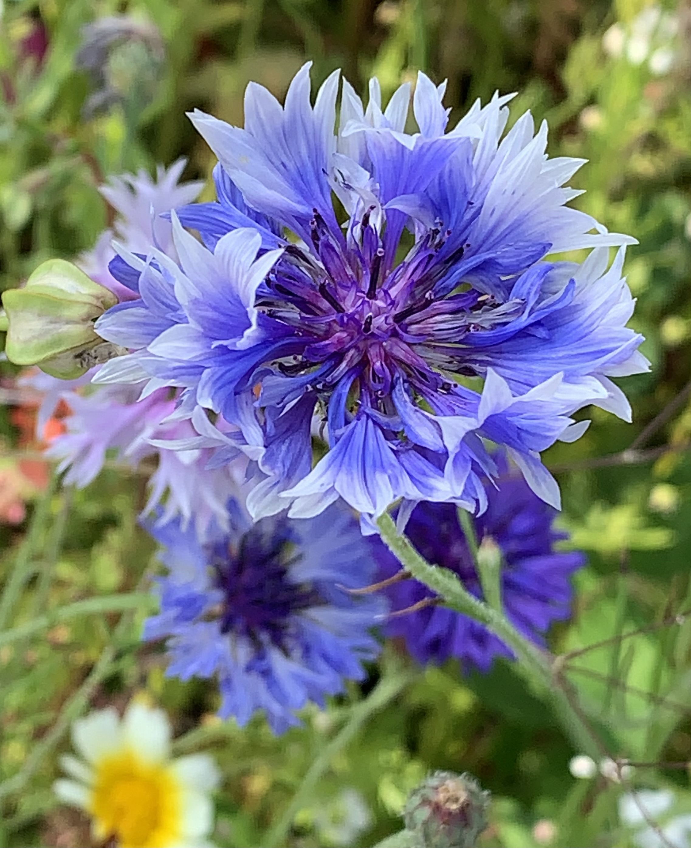 Bijzonder mengsel van de korenbloem. De uiteinden van de bloemblaadjes zijn lichter van kleur. Dat geeft een beeld van met rijp bedekte bloemen. Goede snijbloem. In een zakje zitten circa 150 zaden.