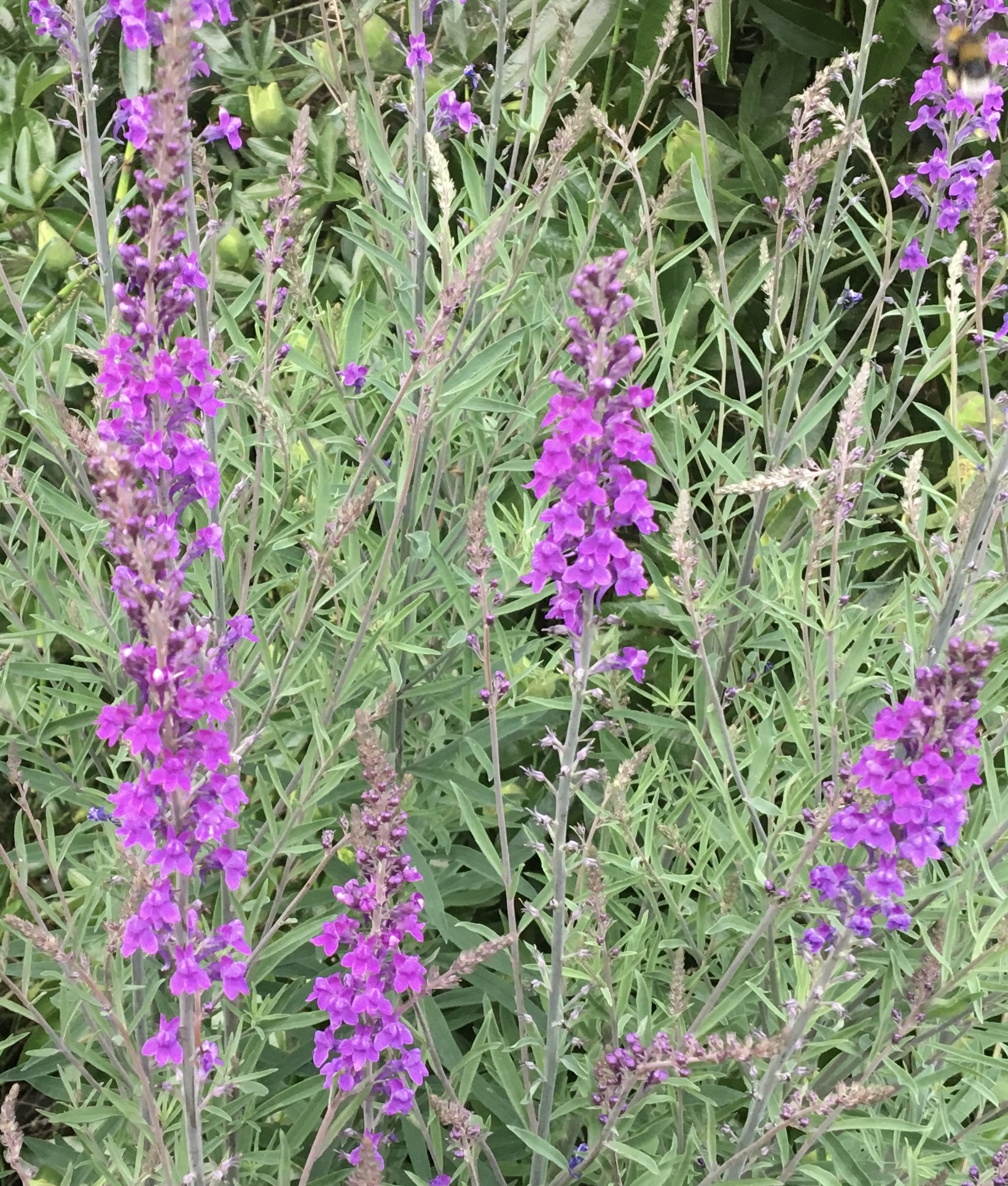 Linaria purpurea of Vlasleeuwenbek is een langbloeiende vaste plant. Kan zich ook uitzaaien maar eigenlijk nooit hinderlijk. De luchtig opgaande bloemstengels passen prima tussen veel andere planten. Van de lichtroze vorm kunnen er wat verdwaalde zaadjes tussen zitten. In principe is het de paarse vorm. Ze zijn aantrekkelijk voor bijen en vlinders. Het is een mooie weefplant. In een zakje zitten ruim 200 zaadjes.