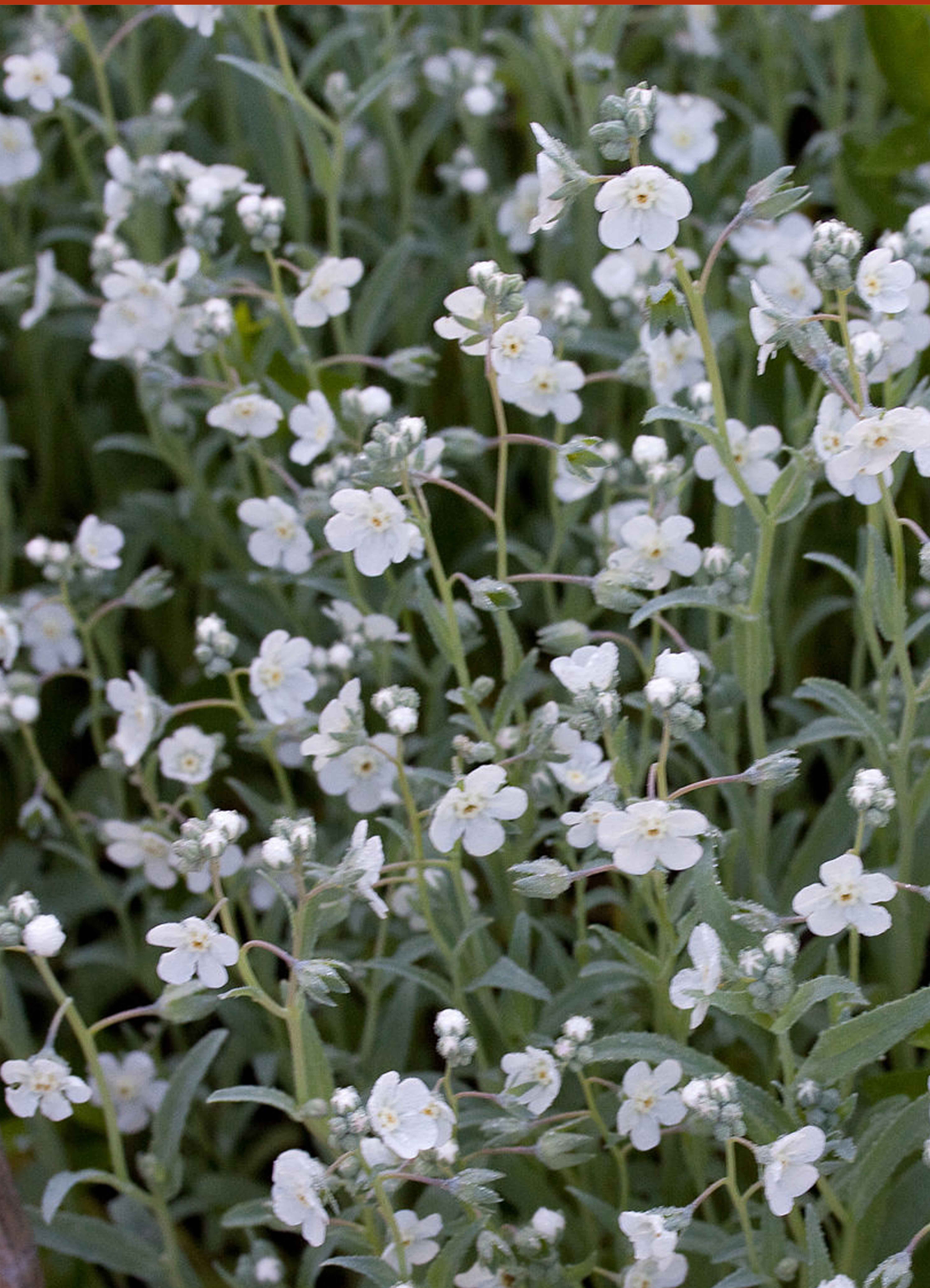 Omphalodes linifolia. Witte onschuld in het Nederlands. Deze eenjarige heeft grijsblauw-groen blad En een opgaande bloeiwijze (circa 40 cm) met talloze vergeetmenietachtige helderwitte bloemen. Bloei vindt plaats van juni t/m oktober. Zaaien kan vanaf maart in potjes en vanaf mei ook ter plaatse. De beste kiem temperatuur zit tussen de 20 en 25 graden. Zonnig tot halfschaduw. Omphalodes behoort tot de Boraginaceae en is daarmee een zusje van het komkommerkruid (Borage), In een zakje zitten circa 150 zaden.