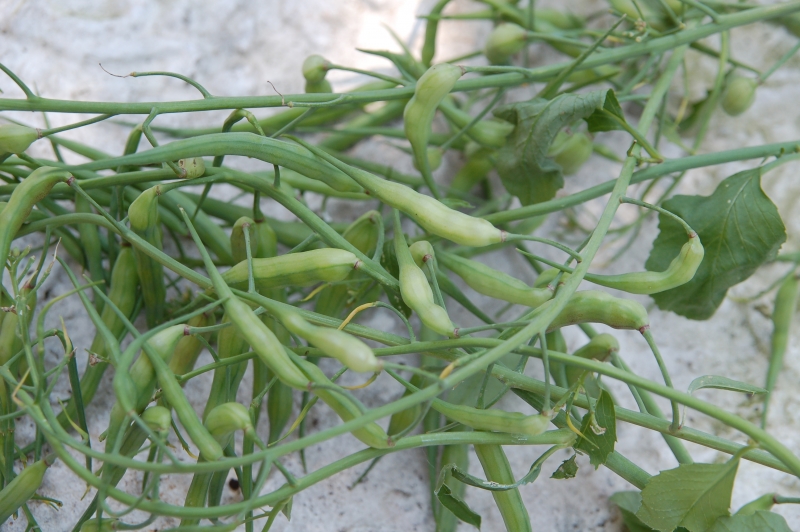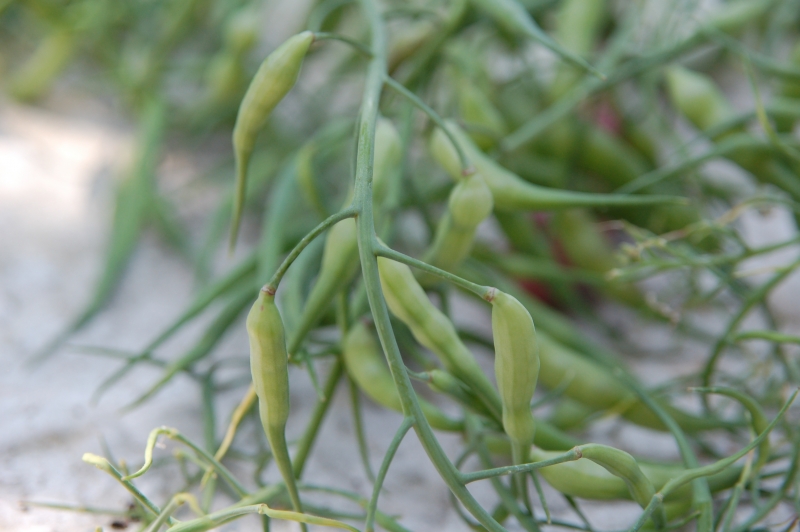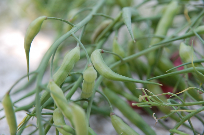 Raphanus caudatus Rat's Tail Radish. Onmisbaar in de oosterse keuken, word gekweekt voor de prachtige violetrode eetbare zaaddozen die wel 30 cm lang kunnen worden. Onrijp oogsten voor consumptie zaaien van maart tot juli bij 15 tot 20 graden, eetbaar met ongeveer 12 weken. in een zakje zitten circa. 250 zaden